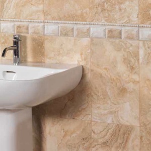 CAESAR STONE FROM COLORKER IS A COORDINATED FLOOR AND WALL TILE WITH THE LOOK OF HIGHLY FIGURED TRAVERTINE STONE. BRING THE OLD WORLD TO YOUR 21ST CENTURY BATHROOM FOR THE ULTIMATE IN ECCLECTICISM.